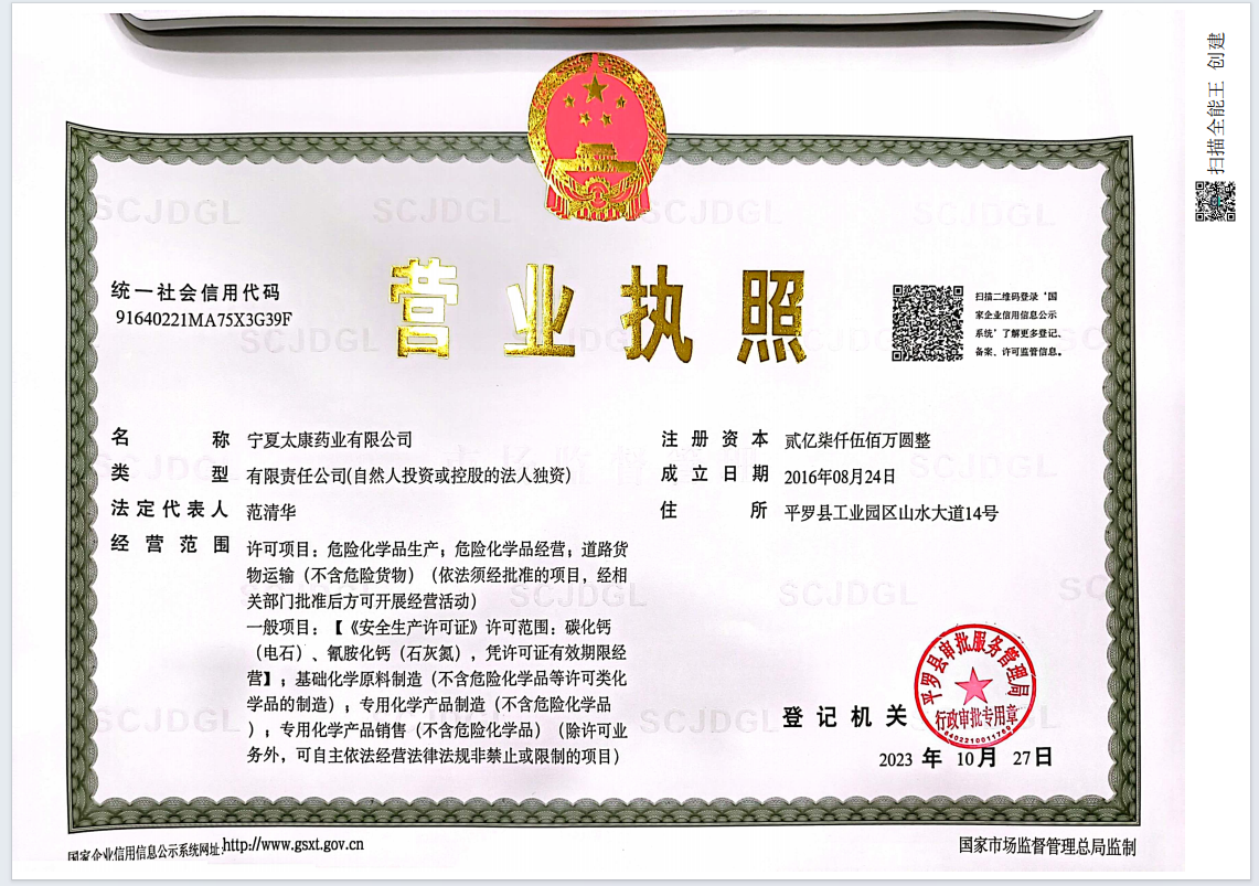 寧夏太康藥業(yè)有限公司是寧夏大地循環(huán)發(fā)展股份有限公司全資控股企業(yè)。工廠(chǎng)占地面積1600畝,擁有固定資產(chǎn)6.74億元人民幣,總裝機(jī)容量16萬(wàn)KVA,是寧夏回族自治區(qū) 40家大型工業(yè)骨干企業(yè)之一。企業(yè)現(xiàn)有員工1100余人,其中主要管理人員134人,專(zhuān)業(yè)技術(shù)人員112人,高級(jí)工程師5人、工程師10人、經(jīng)濟(jì)師3人、技師15人,公司擁有年生產(chǎn)能力:醫(yī)藥中間體產(chǎn)品-雙氰胺6WT、單氰胺5000T、一水肌酸3000T、氨基胍碳酸鹽3000T;化工基礎(chǔ)原料產(chǎn)品-石灰氮22.5WT電石12WT。