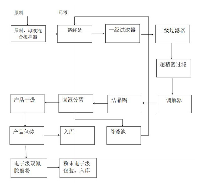 將母液或軟化水打入投料攪拌器,按照比例投入雙氰胺,經(jīng)泵打入溶解釜,升溫充分溶解后,放入溶解液儲罐后經(jīng)泵打入一級過濾器,過濾液進(jìn)入一級濾液儲罐,再經(jīng)泵打入二級過濾器,進(jìn)行精密過濾,濾液經(jīng)精密過濾器出口再經(jīng)超精密過濾器打入結(jié)晶鍋中結(jié)晶,冷卻結(jié)晶后由結(jié)晶鍋放出,經(jīng)離心機(jī)進(jìn)行固液分離,分離后的濕結(jié)晶體經(jīng)螺旋機(jī)送入燥機(jī)干燥,干燥后的成品,稱量、包裝。