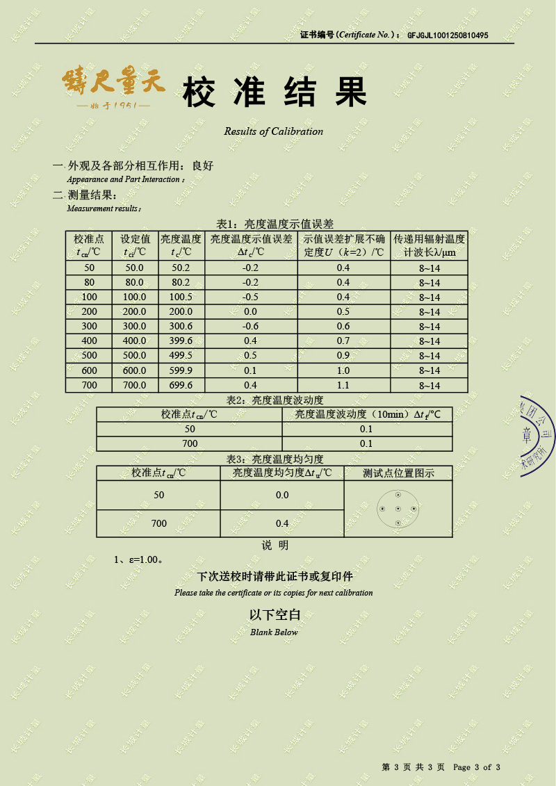 腔式黑體輻射源(50-700℃)校準證書 2025-9-3 本文被閱讀 2303 次