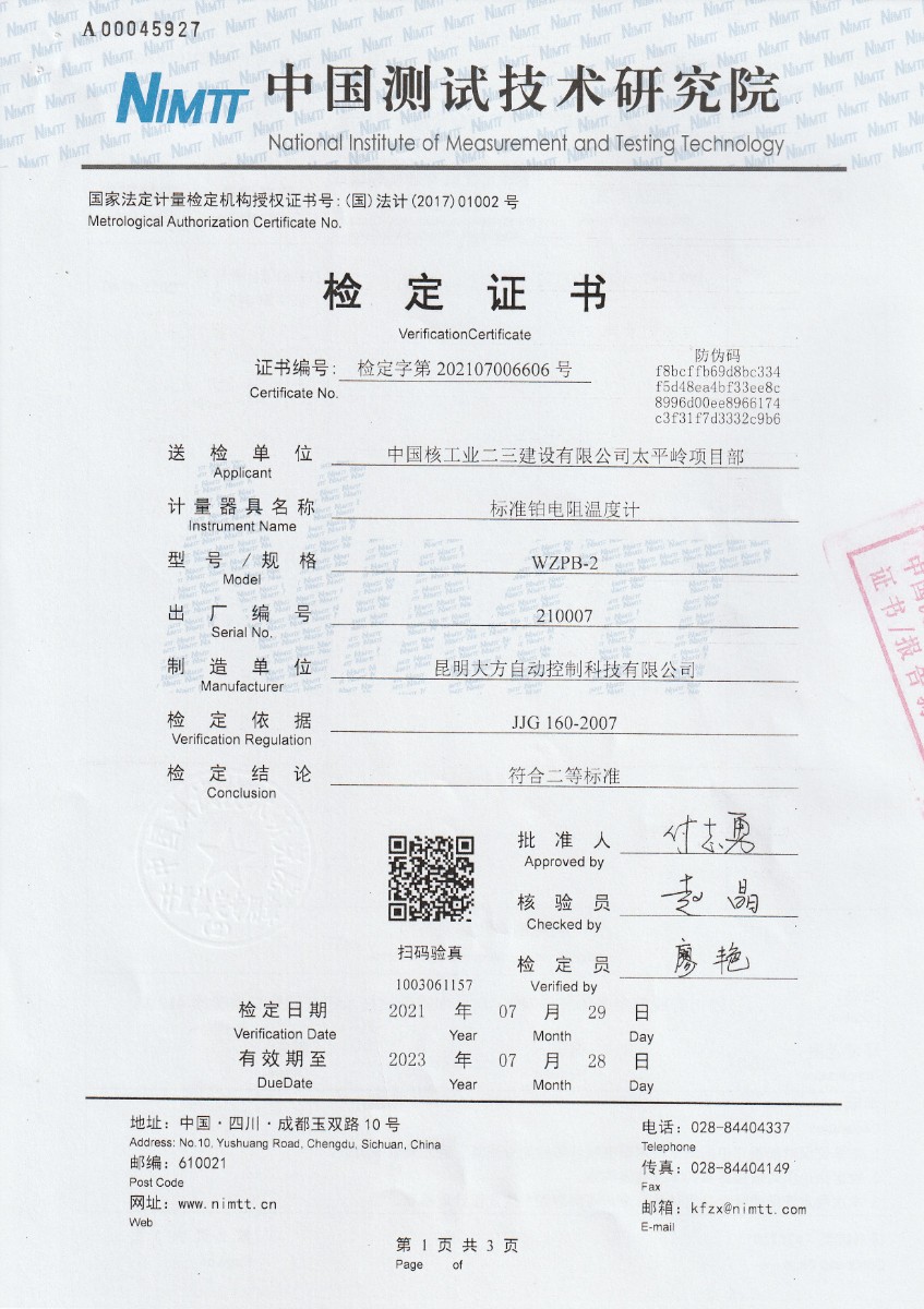 中國(guó)核工業(yè)二三建設(shè)有限公司太平嶺項(xiàng)目部-標(biāo)準(zhǔn)鉑電阻溫度計(jì) 2021-7-31 本文被閱讀 16798 次