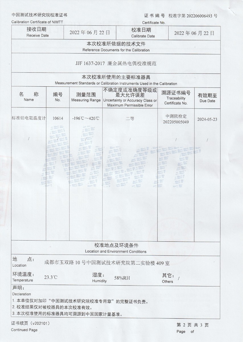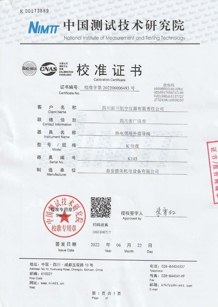 | 上一條:四川新川航空儀器有限責(zé)任公司-S分度補(bǔ)償導(dǎo)線 | 下一條:高精度制冷恒溫槽(-80~100℃)校準(zhǔn)證書(shū) |