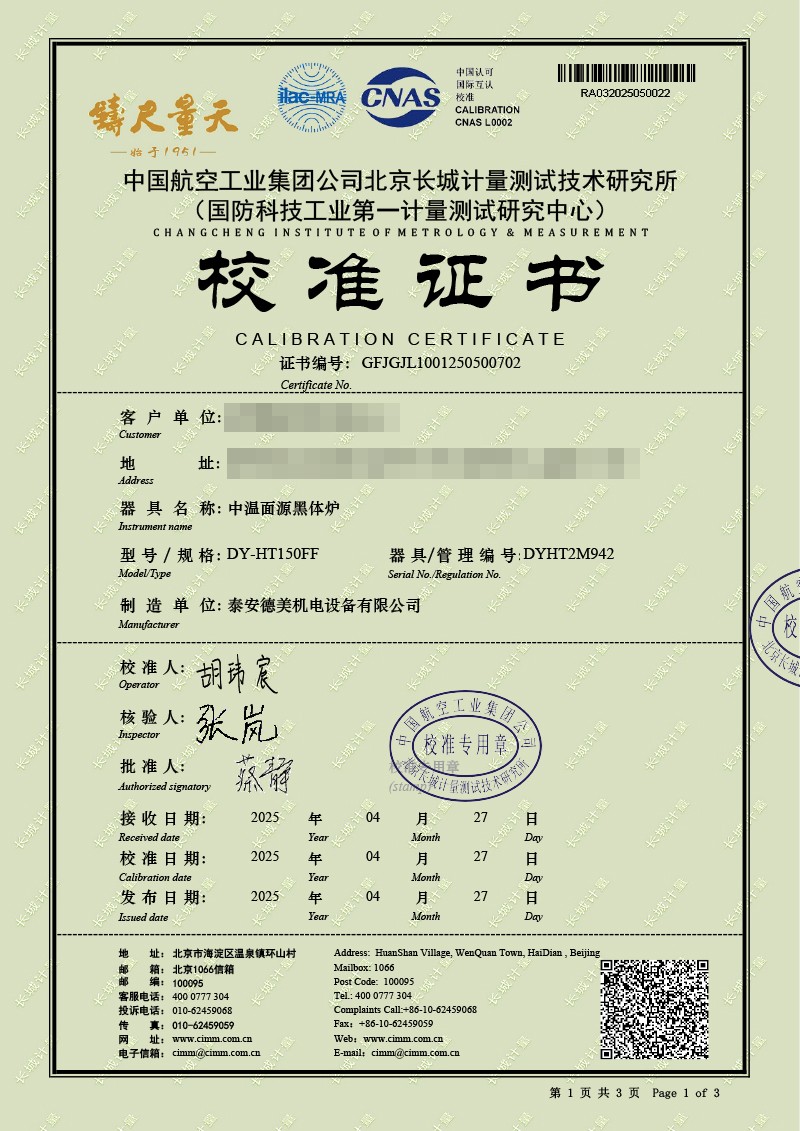 面源黑體爐(室溫+5-500℃)校準證書 2025-5-9 本文被閱讀 3281 次