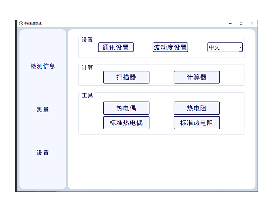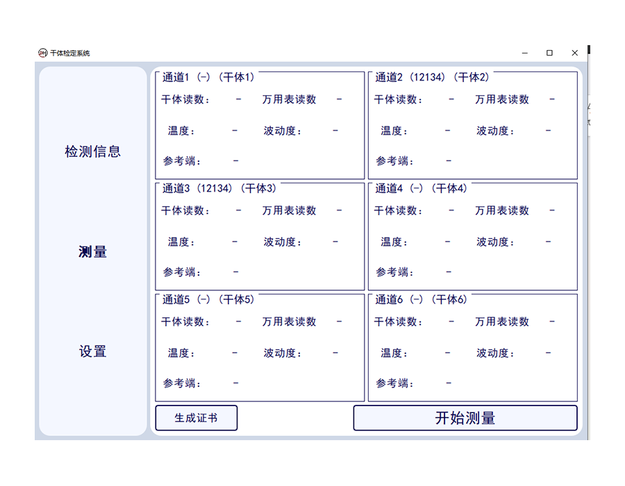 測(cè)量狀態(tài)可進(jìn)行多通道狀態(tài)干體爐,萬用表讀數(shù)。當(dāng)前標(biāo)準(zhǔn)器溫度,溫度波動(dòng)性等數(shù)據(jù)的讀取,并一鍵生成證書??蓪?shí)現(xiàn)一鍵中英文切換。
