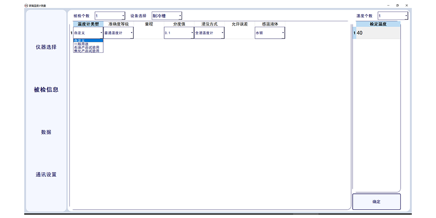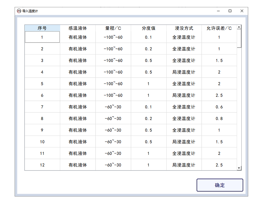 4.可進(jìn)行玻璃溫度計(jì)的類型選擇,選擇分度值、浸沒(méi)類型計(jì)允差,判斷溫度是否合格,