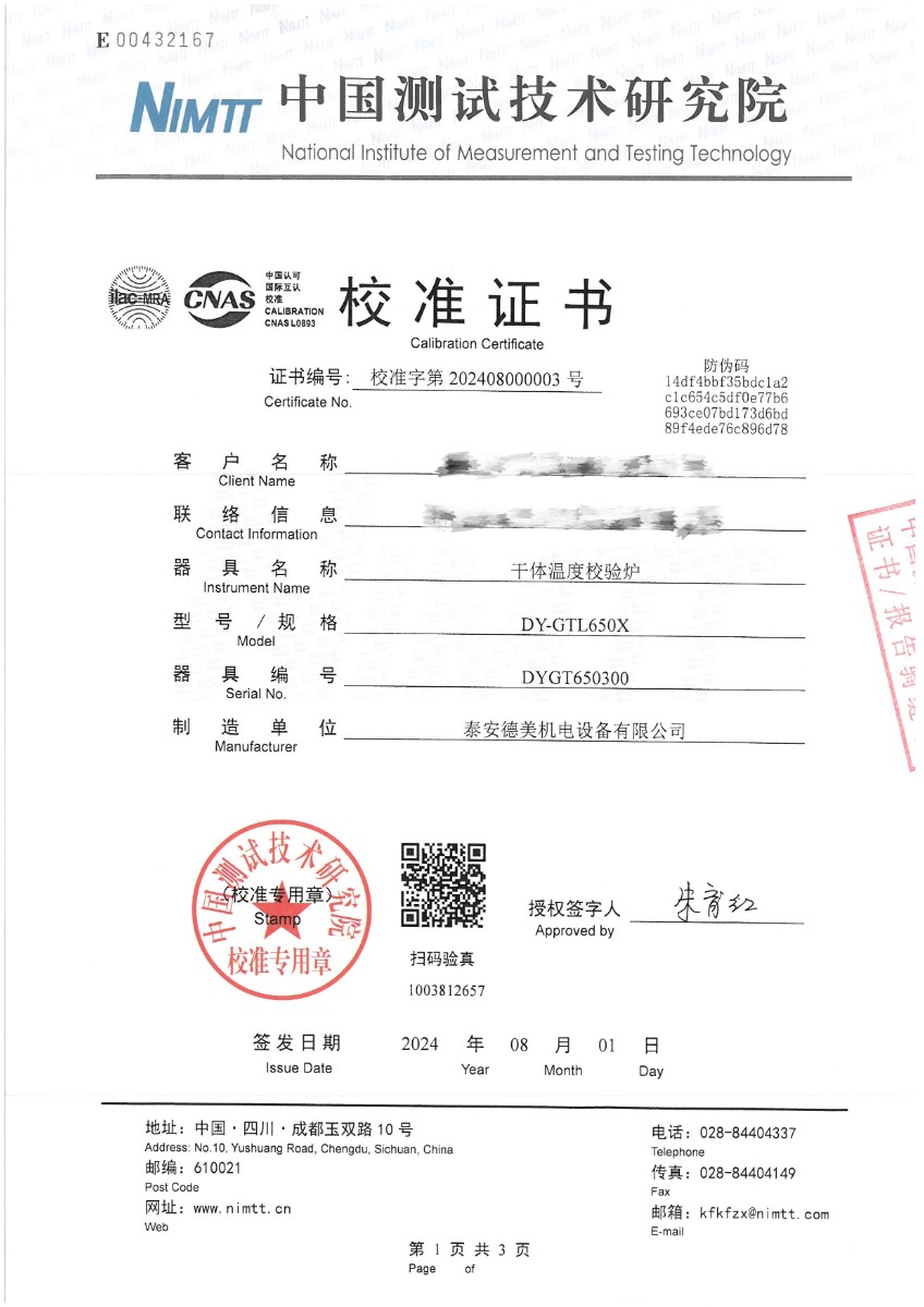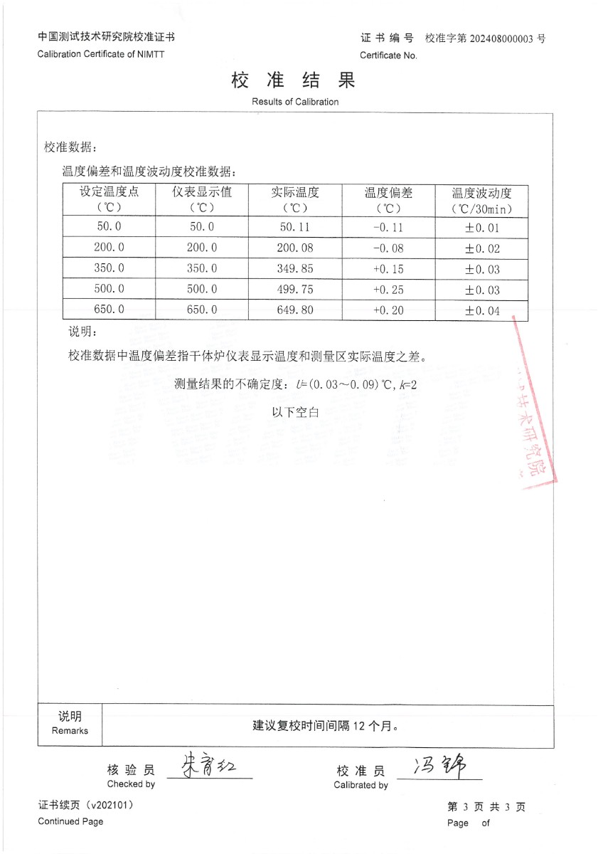 干體爐300(室溫+5℃~650℃)校準證書 2024-8-5 本文被閱讀 6850 次