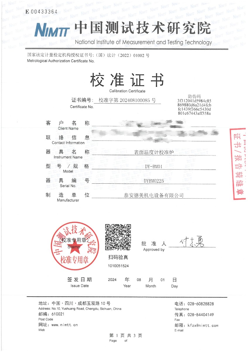表面溫度計(室溫+5~400℃)校準證書 2024-8-12 本文被閱讀 7370 次