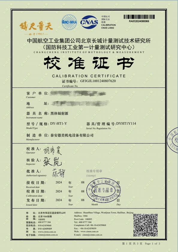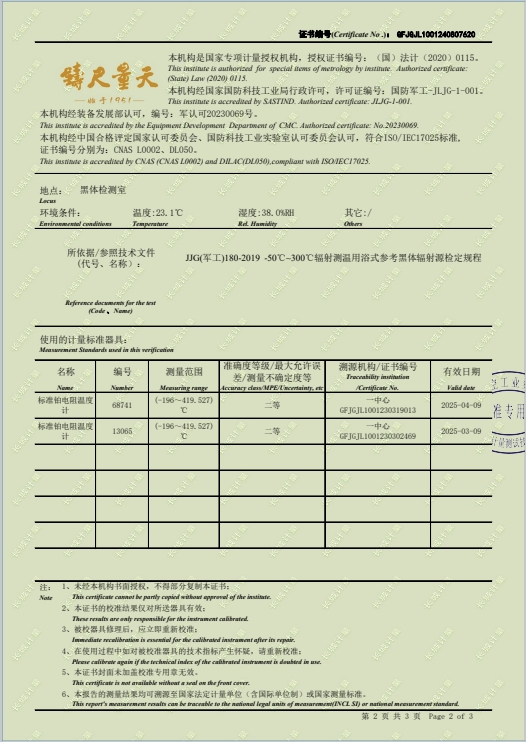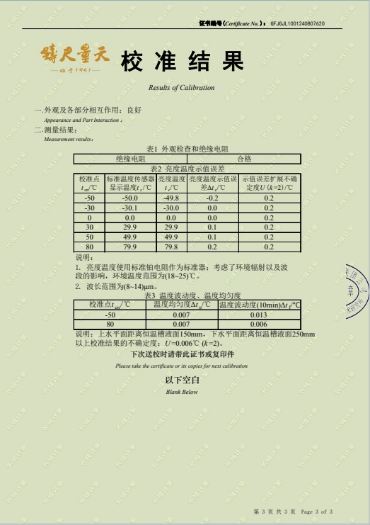 黑體輻射源-(-50~80(100℃))校準證書 2024-8-29 本文被閱讀 7632 次