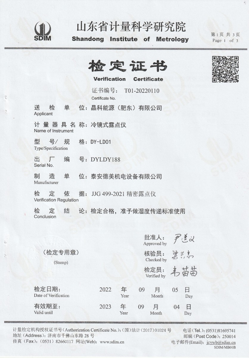 | 上一條:晶科能源(肥東)有限公司-溫濕度檢定箱 | 下一條:露點(diǎn)儀檢定、校準(zhǔn)證書 |
