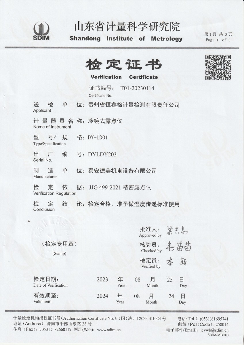 貴州省恒鑫格計量檢測有限責任公司-冷鏡式露點儀檢定證書 2023-9-4 本文被閱讀 9192 次