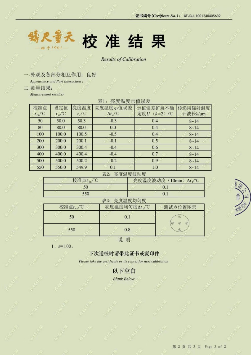 黑體爐校準證書 2024-4-24 本文被閱讀 9118 次