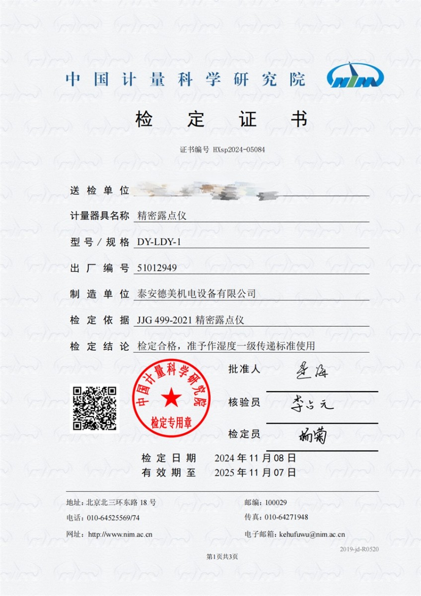冷鏡式露點(diǎn)儀檢定證書