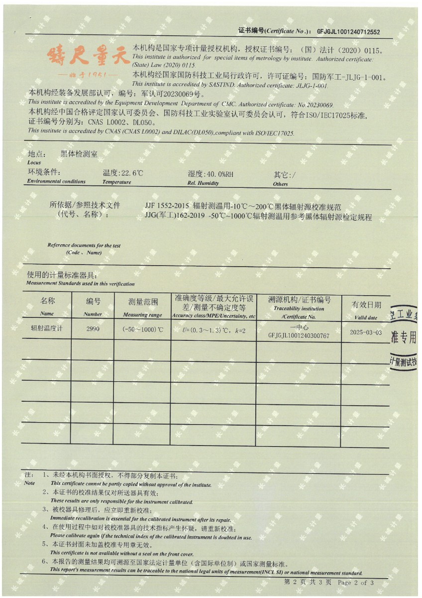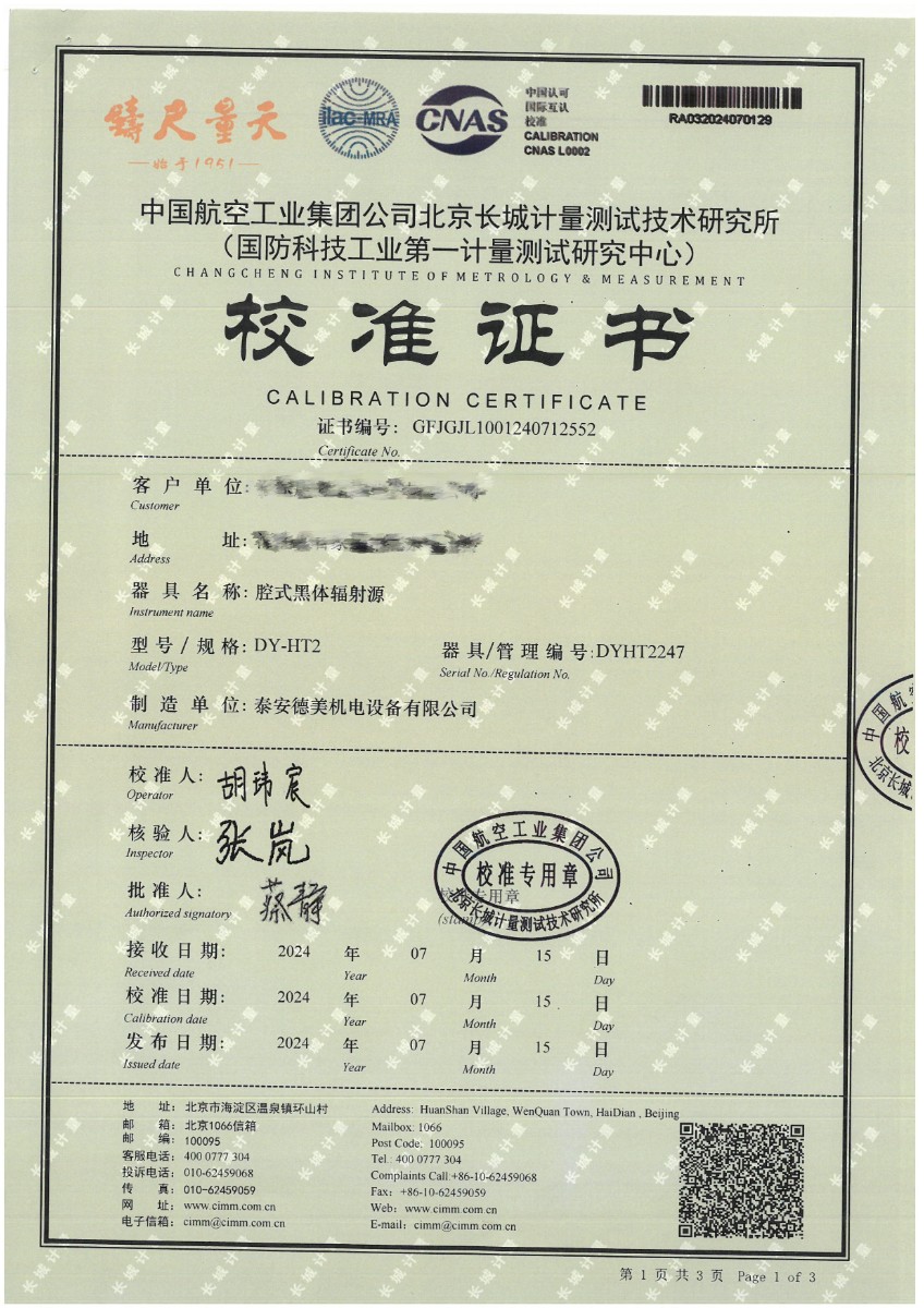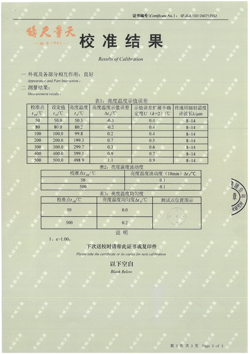 腔式黑體(50~500℃)校準證書 2024-7-29 本文被閱讀 7970 次