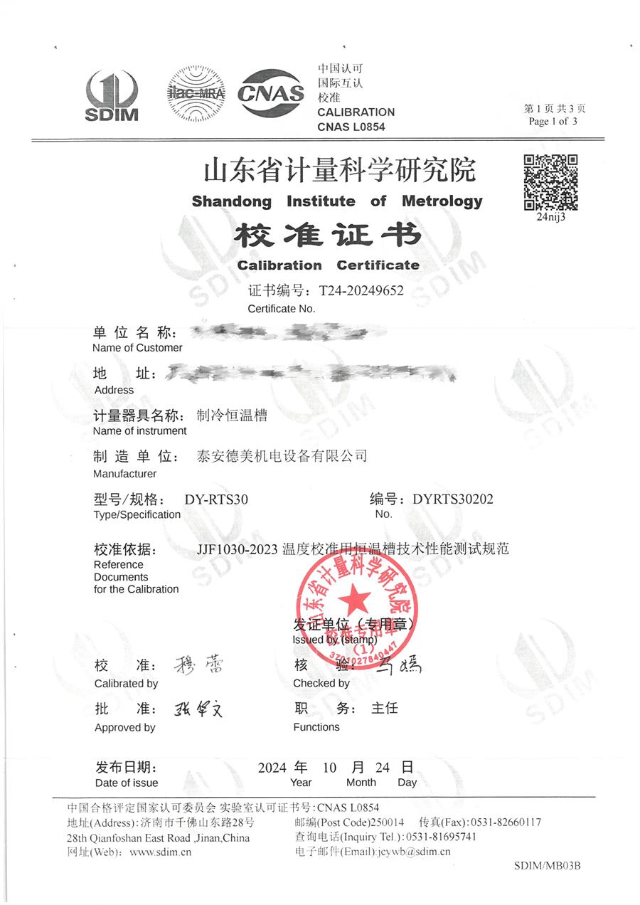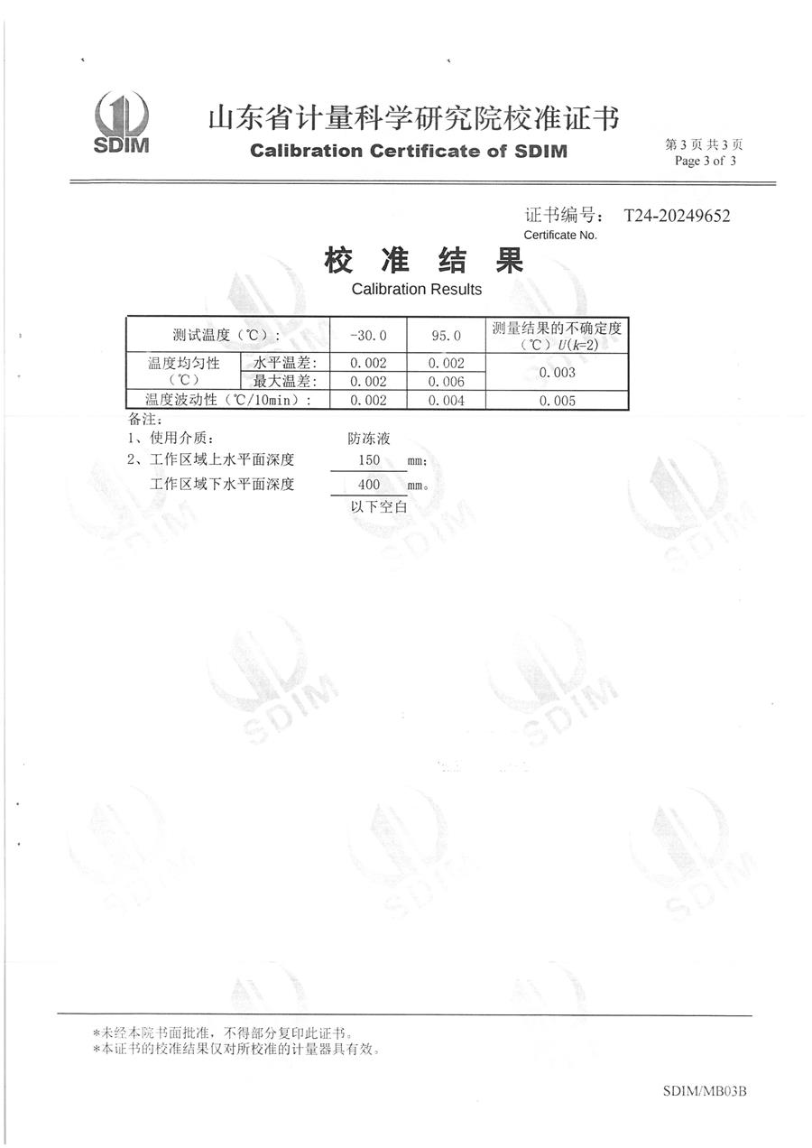 制冷恒溫槽(-30-95℃)校準證書 2024-11-2 本文被閱讀 7112 次