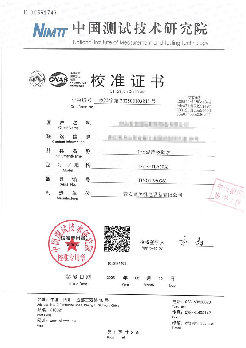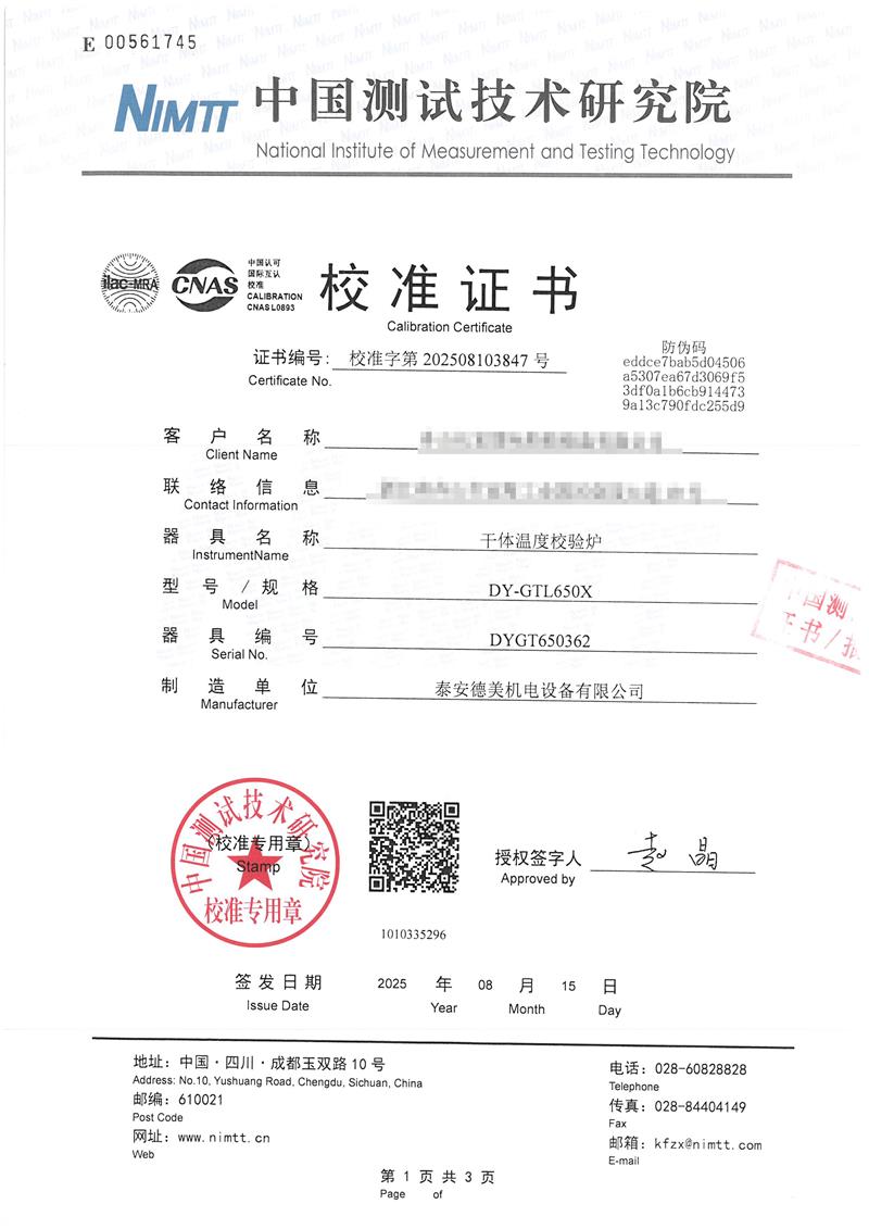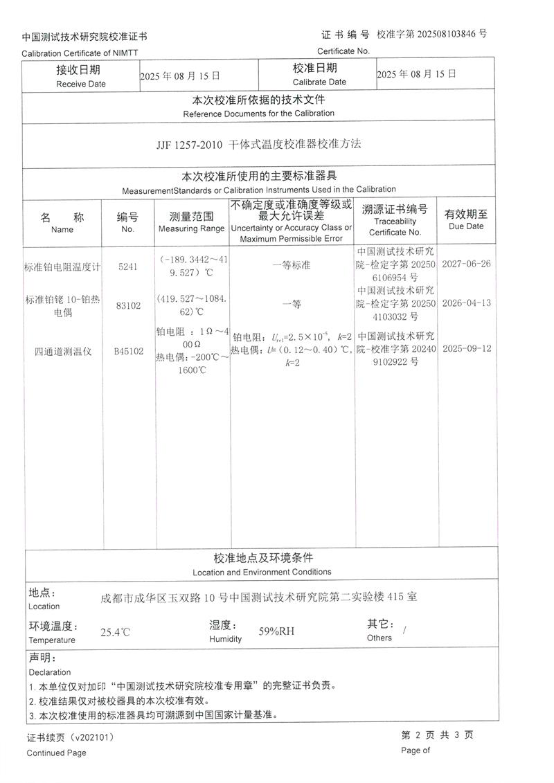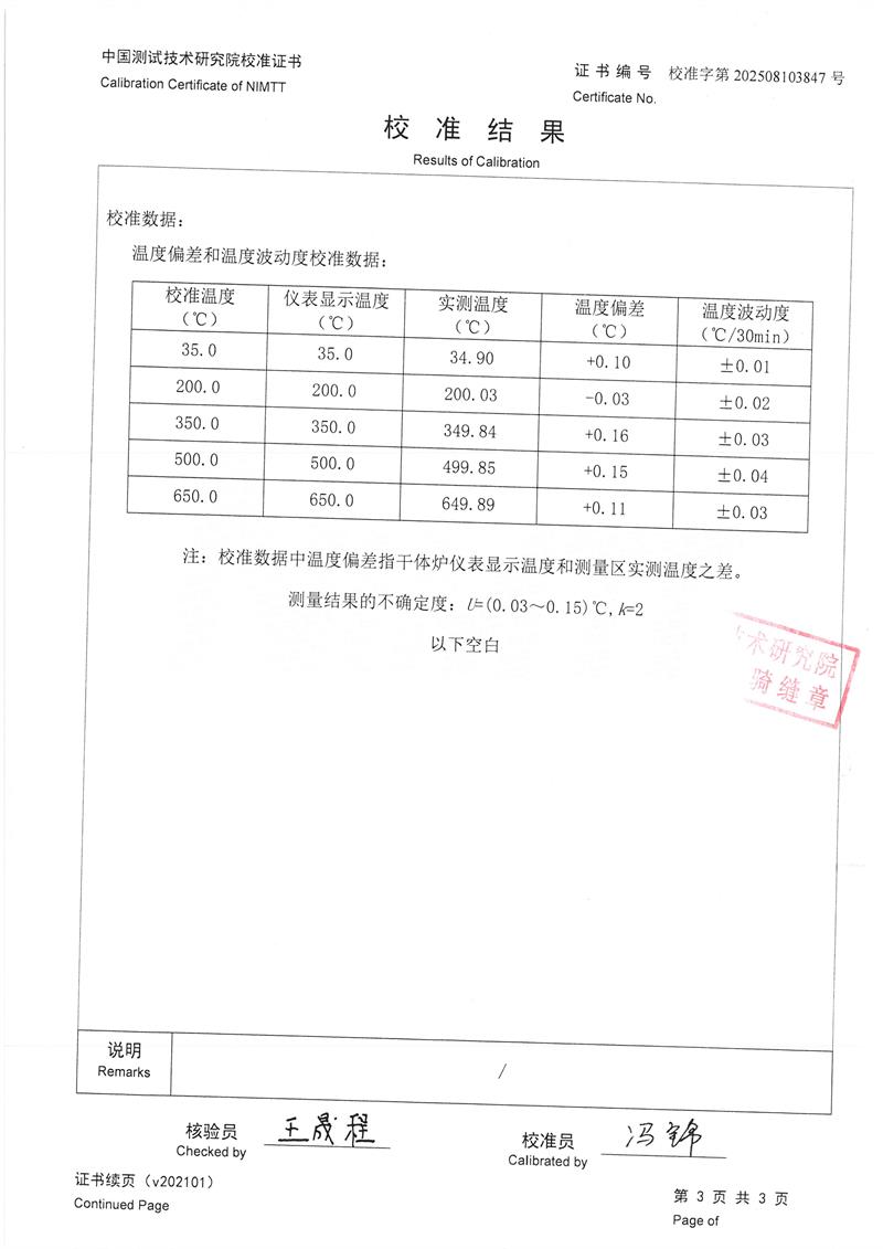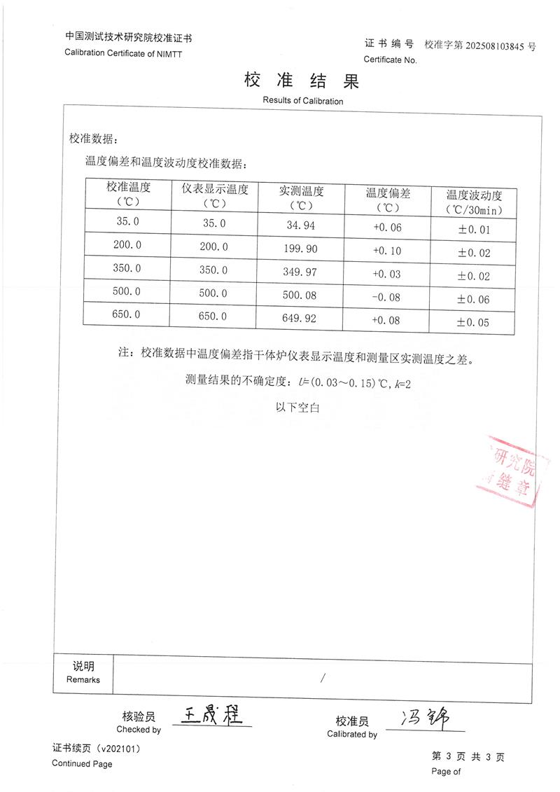 干體爐(室溫+5℃~650℃)校準(zhǔn)證書 2025-8-20 本文被閱讀 2879 次