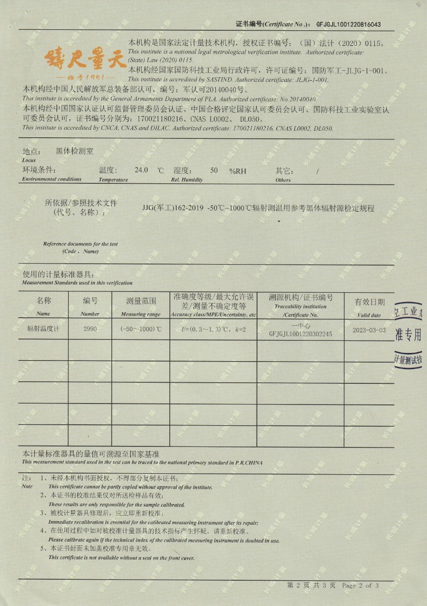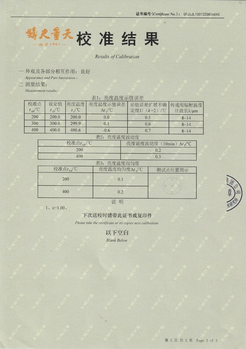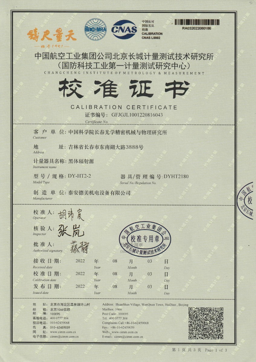 | 上一條:中國科學院長春光學精密機械與物理研究所-黑體爐DY-HT2-1 | 下一條:高精度制冷恒溫槽(-80~100℃)校準證書 |
