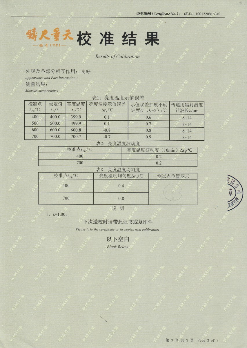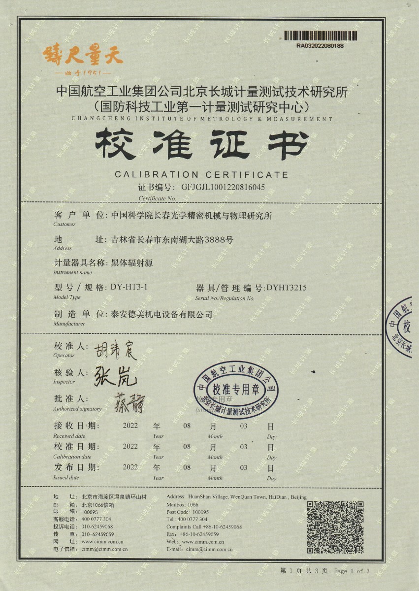 | 上一條:中國科學(xué)院長春光學(xué)精密機(jī)械與物理研究所-黑體爐DY-HT2-11 | 下一條:高精度制冷恒溫槽(-80~100℃)校準(zhǔn)證書 |