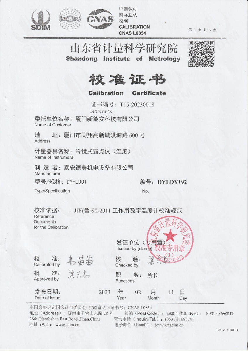 | 上一條:廈門新能安科技有限公司 冷鏡式露點(diǎn)儀 檢定證書 | 下一條:高精度制冷恒溫槽(-80~100℃)校準(zhǔn)證書 |