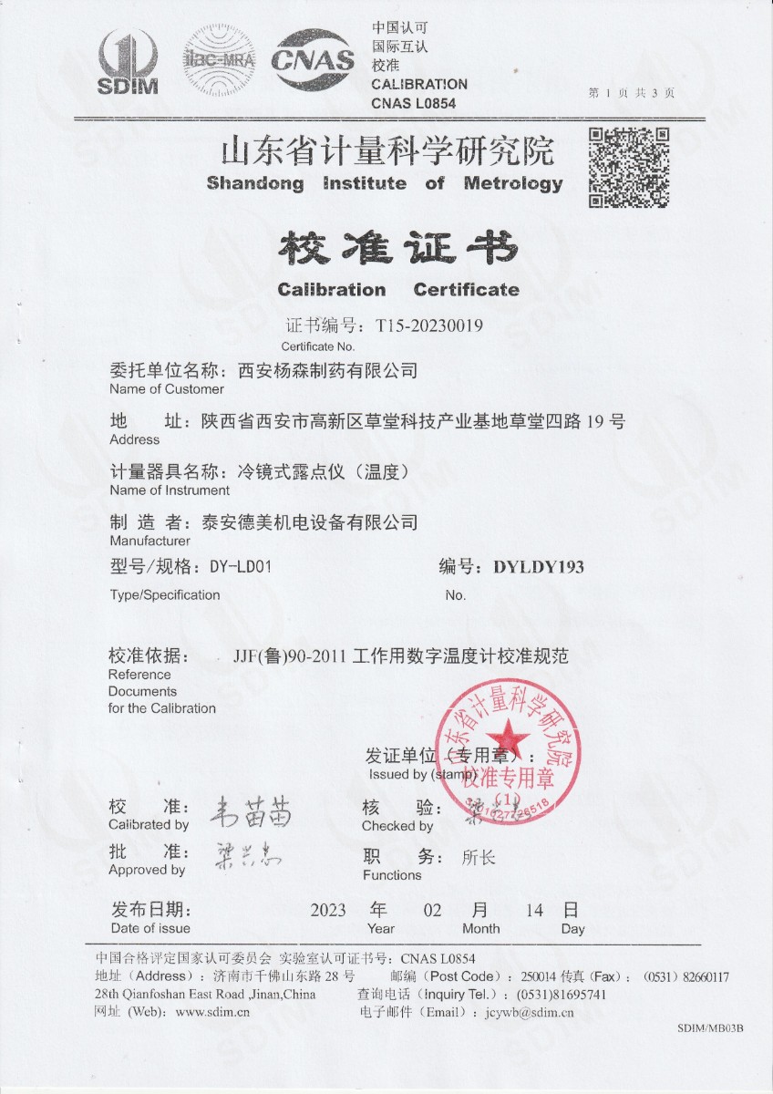 西安楊森制藥有限公司 冷鏡式露點儀(溫度) 校準證書 2023-2-25 本文被閱讀 13080 次