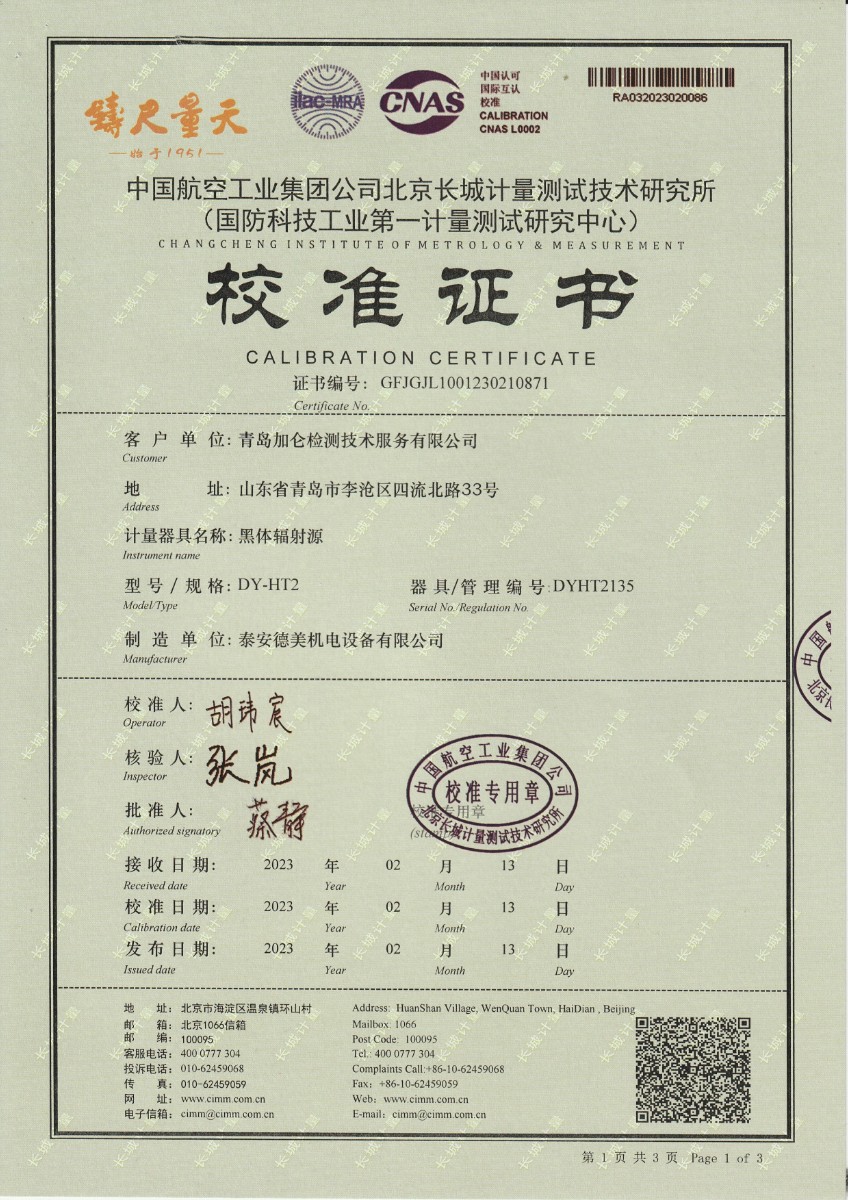 青島加侖檢測技術(shù)服務(wù)有限公司 黑體輻射源 校準證書