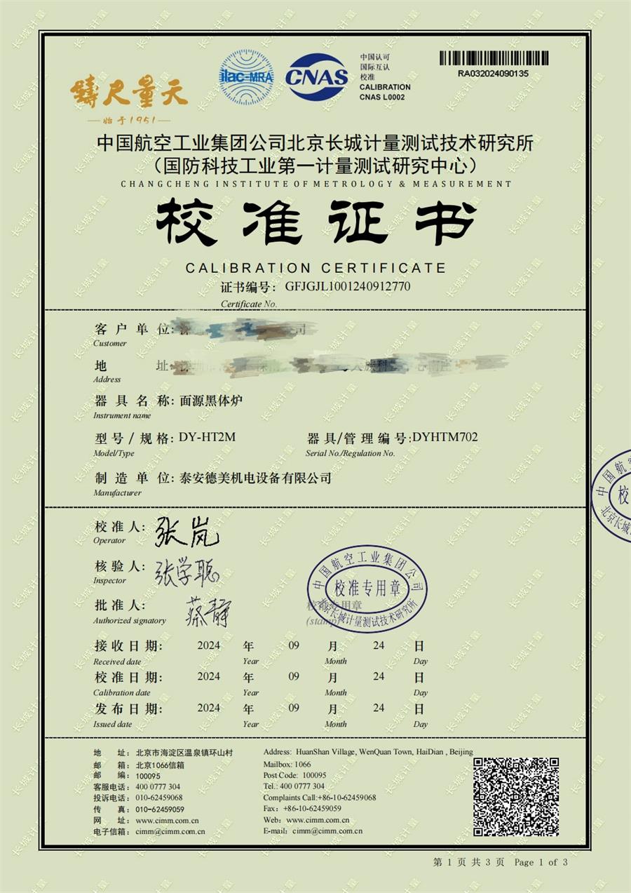 | 上一條:面源黑體爐(室溫+5-500℃)校準(zhǔn)證書(shū) | 下一條:高精度制冷恒溫槽(-80~100℃)校準(zhǔn)證書(shū) |