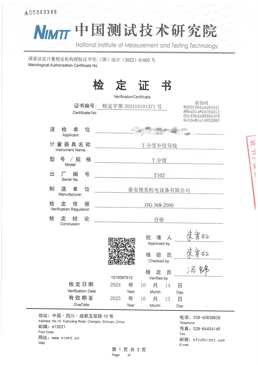 T分度補償導線檢定證書 2024-10-17 本文被閱讀 6658 次