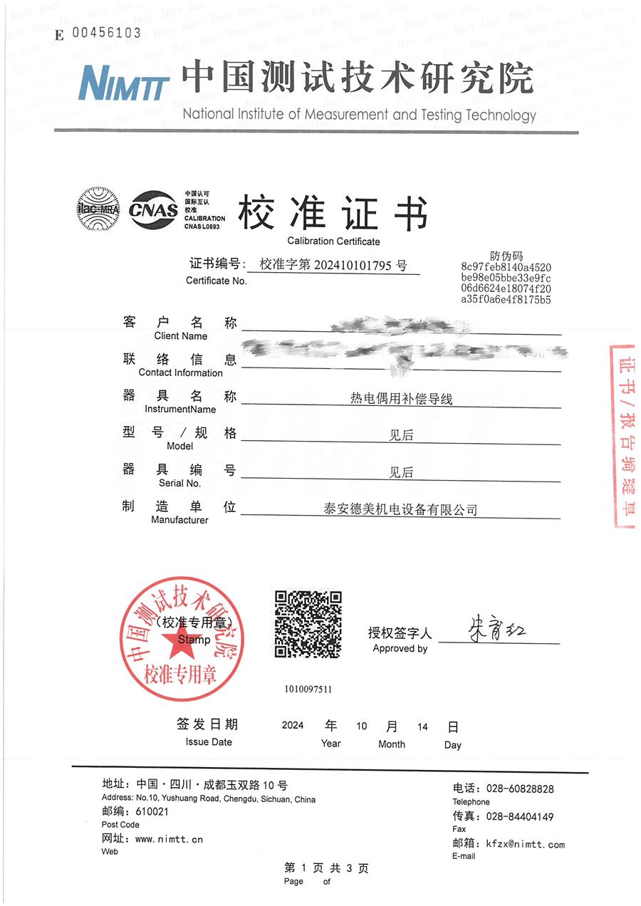 上一條:T分度補(bǔ)償導(dǎo)線檢定證書下一條:高精度制冷恒溫槽(-80~100℃)校準(zhǔn)證書