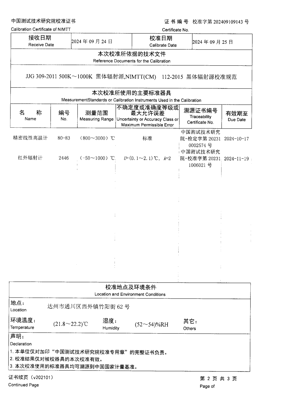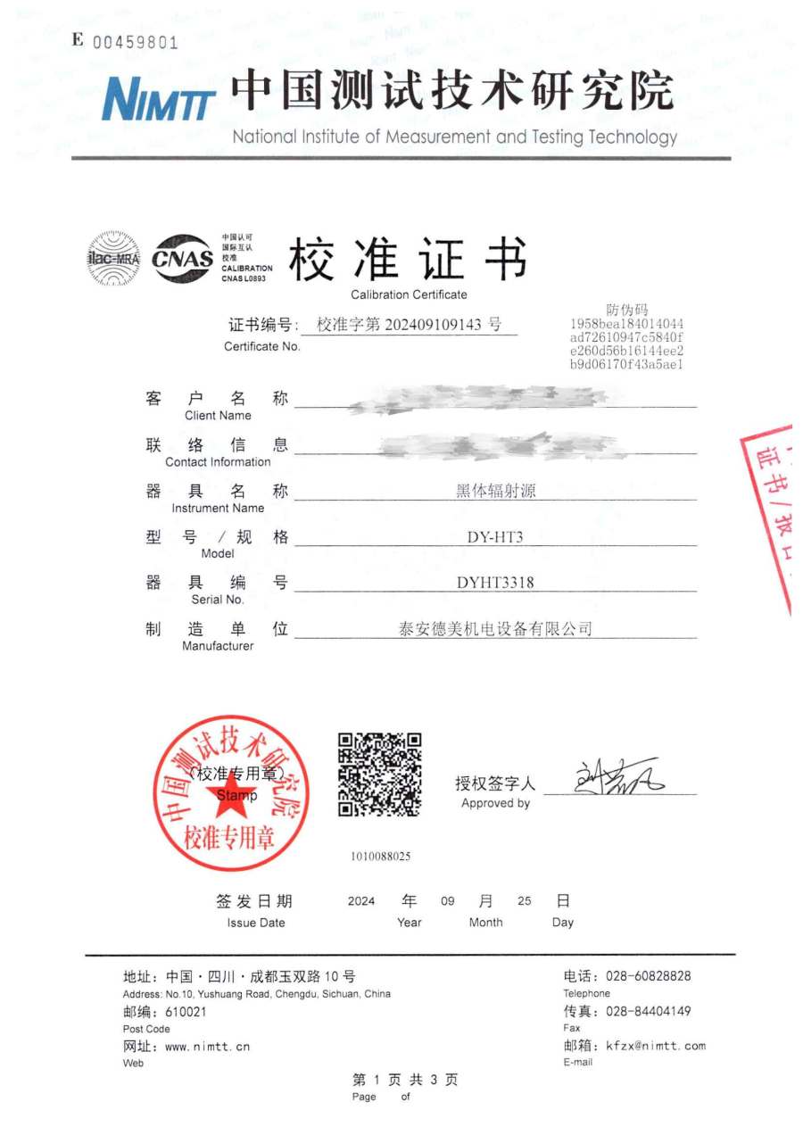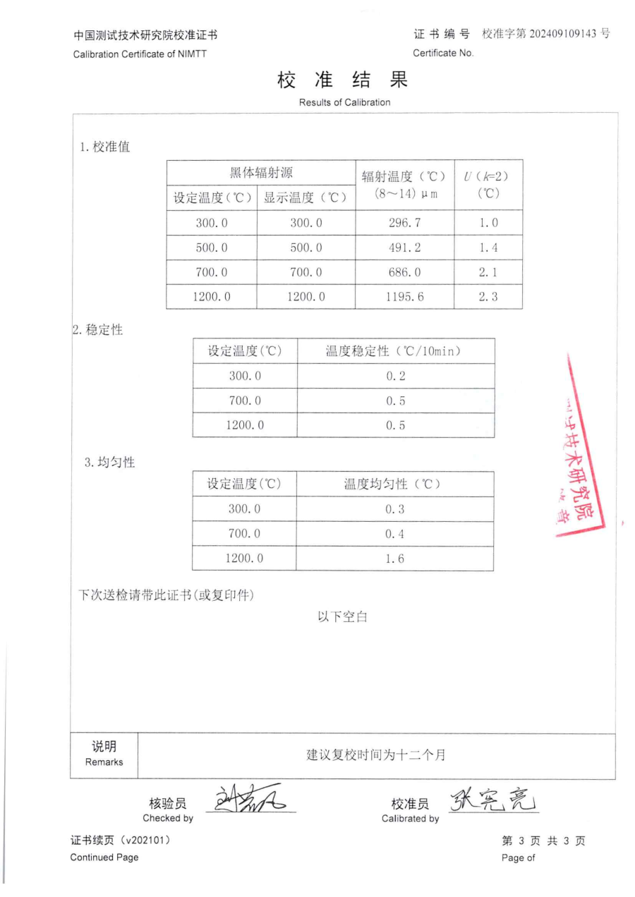 高溫腔式黑體校準證書 2024-10-21 本文被閱讀 7468 次