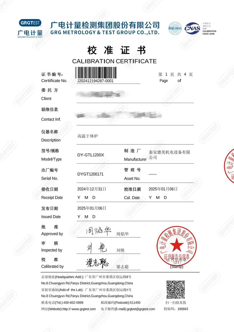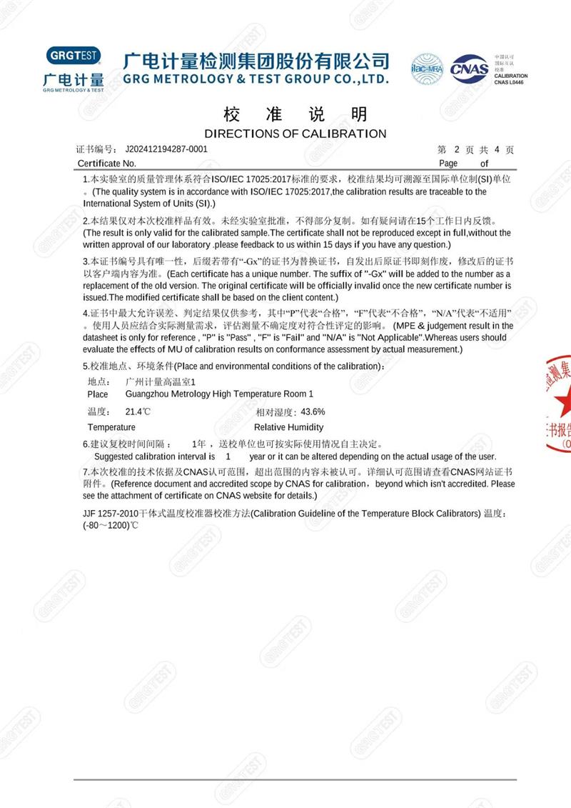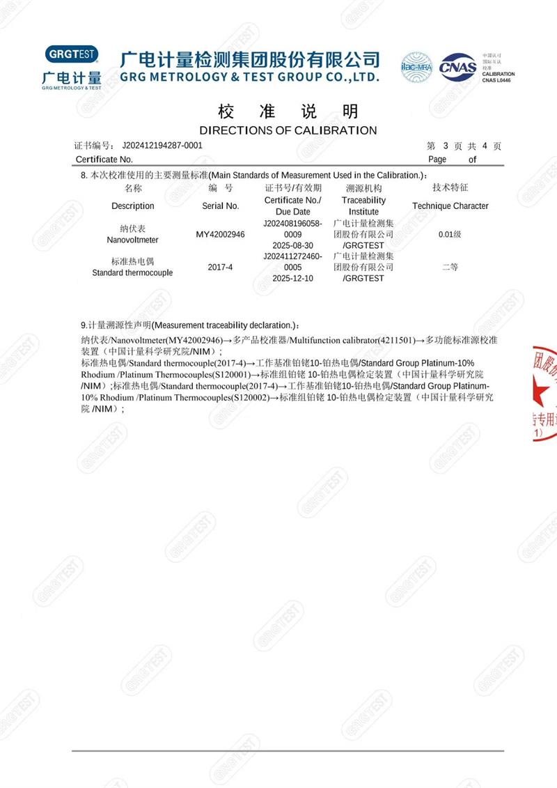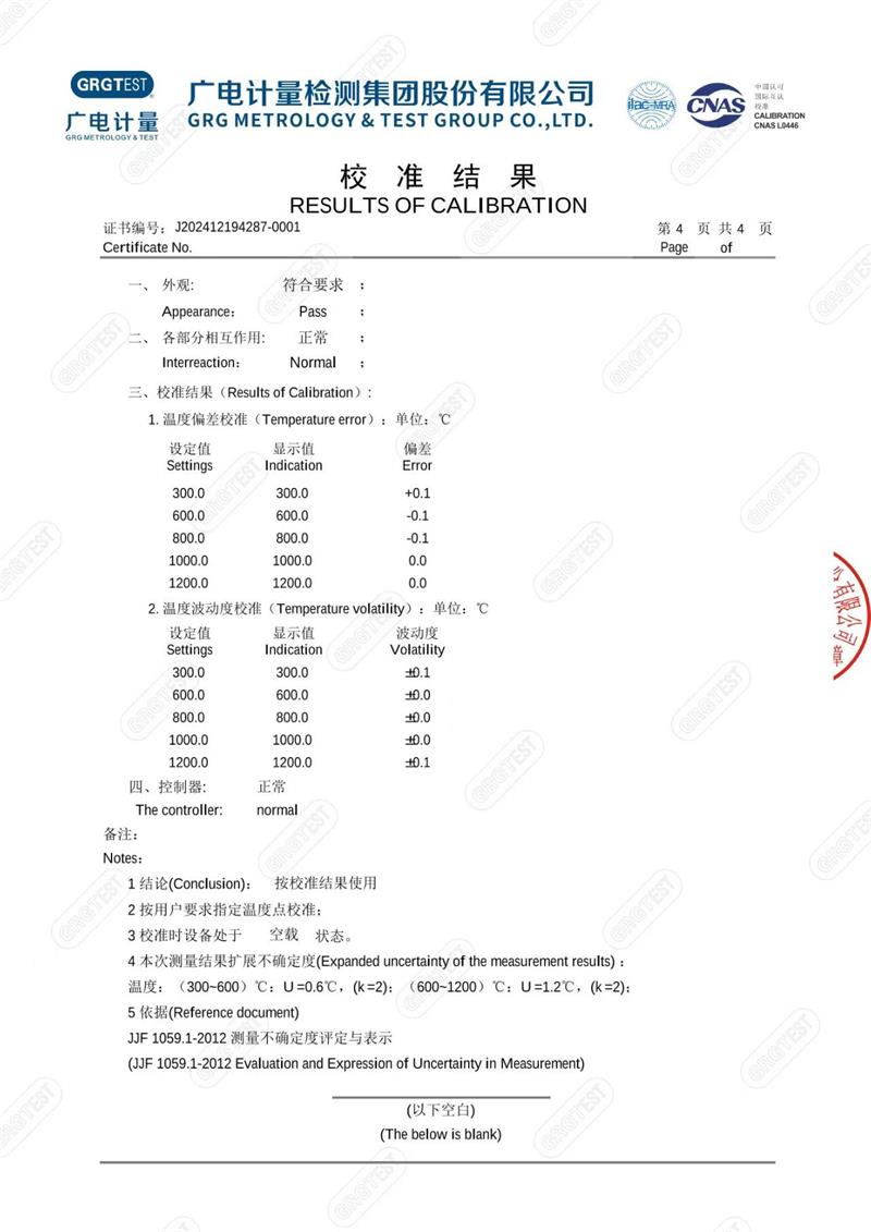 高溫干體爐(300-1200℃)校準證書 2025-1-13 本文被閱讀 6408 次