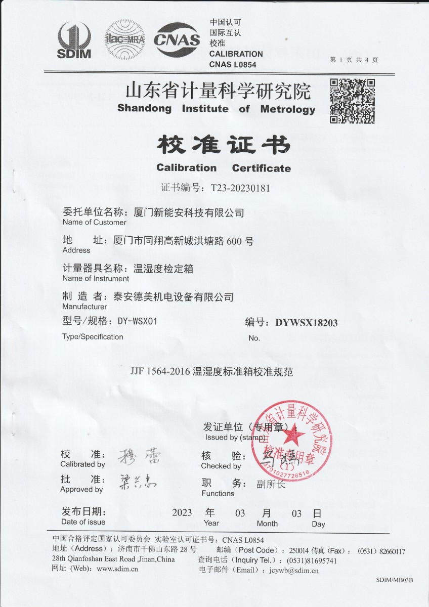 廈門新能安科技有限公司 溫濕度檢定箱 校準證書 2023-3-13 本文被閱讀 11927 次