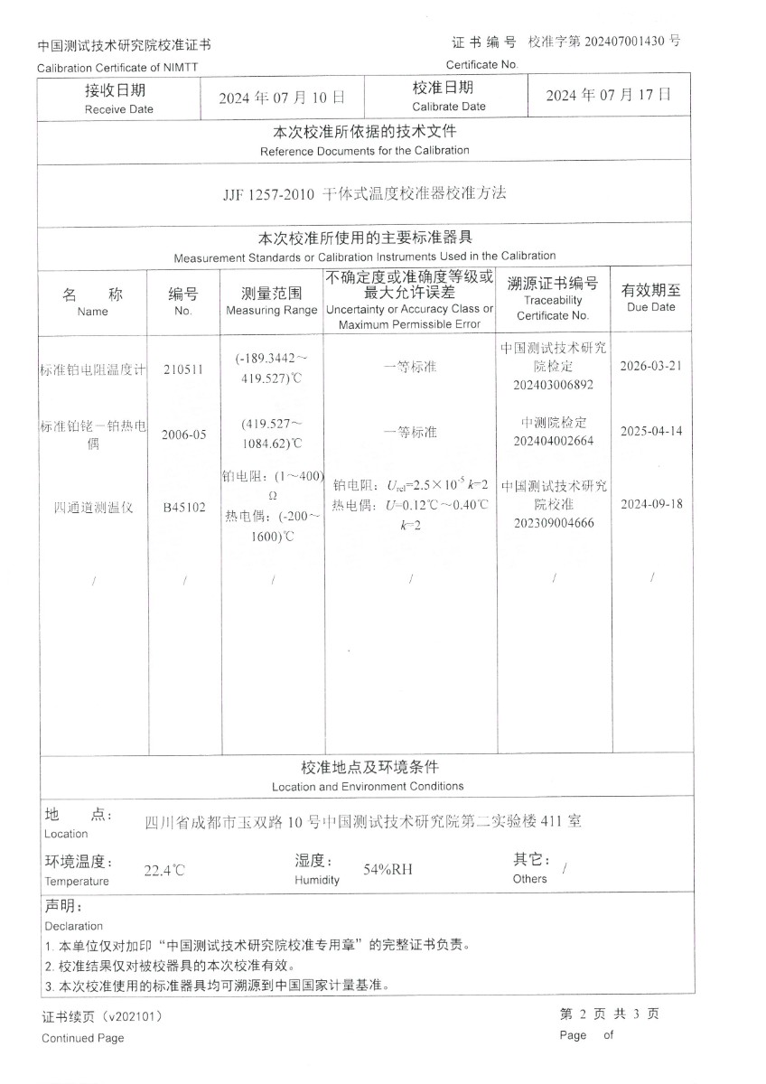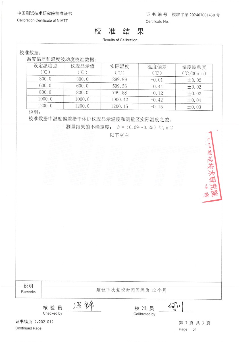 干體爐(300~1200)校準證書 2024-7-19 本文被閱讀 6869 次