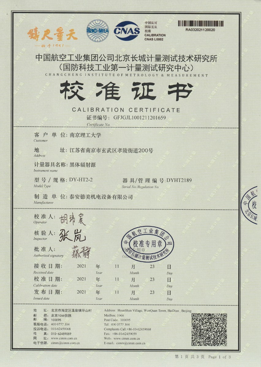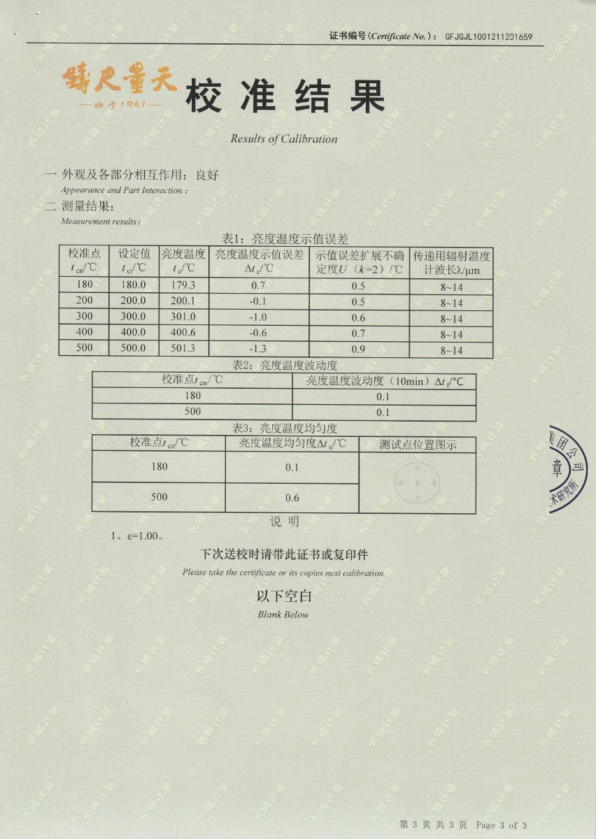 | 上一條:南京理工大學-黑體輻射源校準證書40-250℃ | 下一條:高精度制冷恒溫槽(-80~100℃)校準證書 |