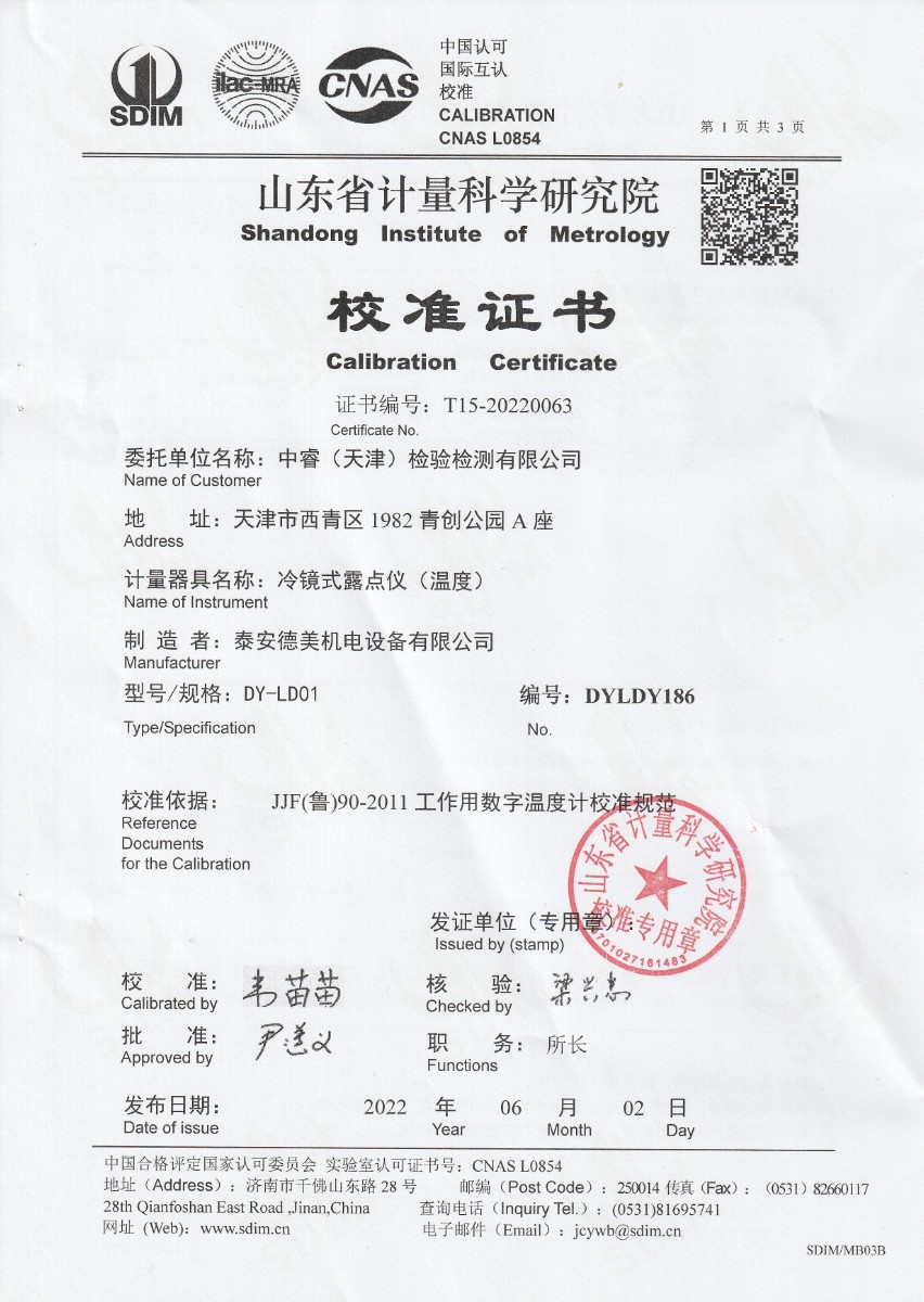 中睿(天津)檢驗檢測有限公司-冷鏡式露點儀校準證書 2022-6-14 本文被閱讀 15104 次