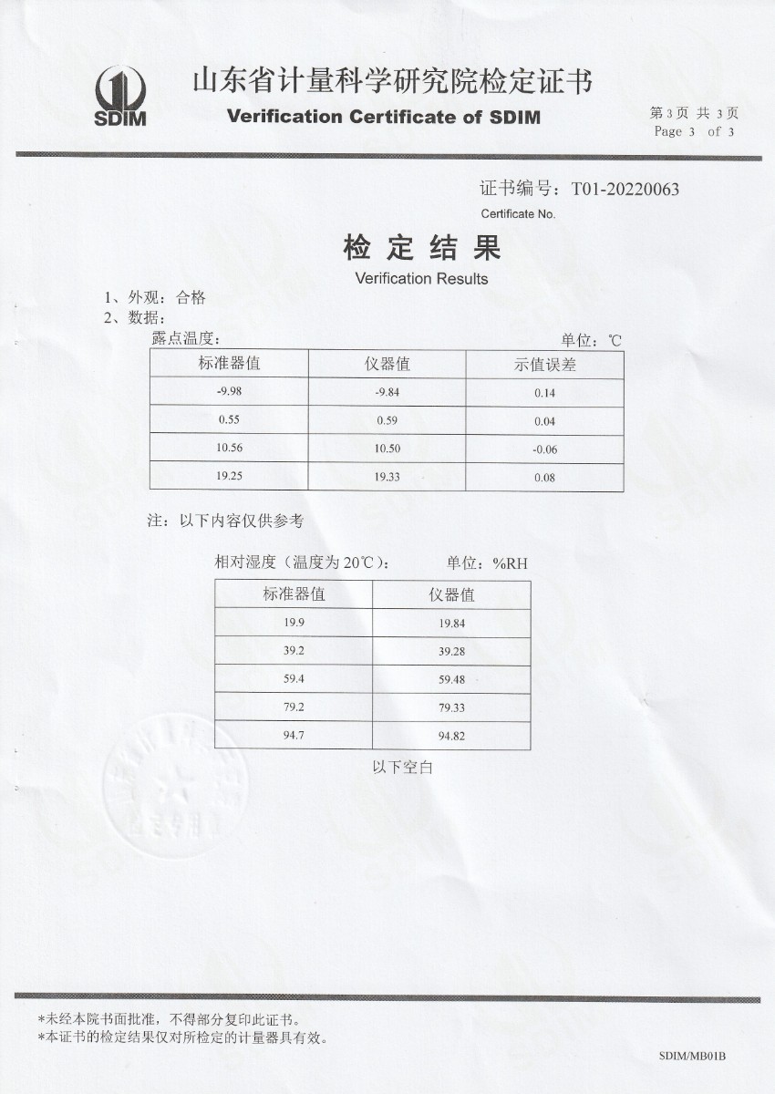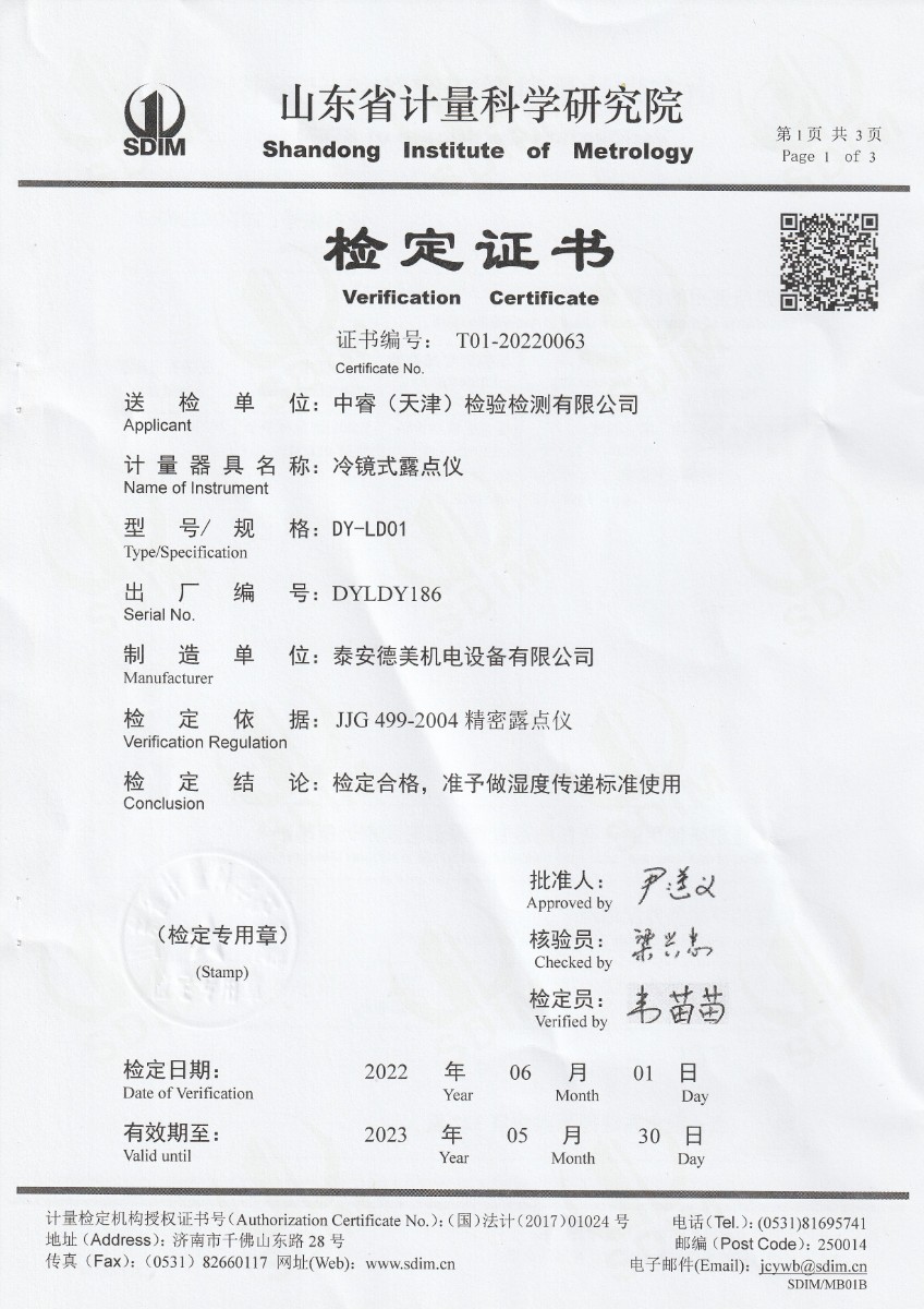 | 上一條:中睿(天津)檢驗(yàn)檢測(cè)有限公司-冷鏡式露點(diǎn)儀校準(zhǔn)證書 | 下一條:露點(diǎn)儀檢定、校準(zhǔn)證書 |