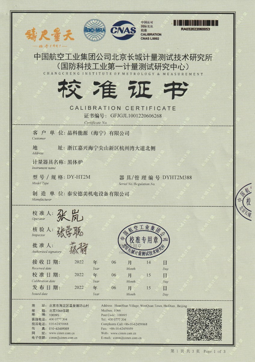 晶科能源(海寧)有限公司-黑體爐 2022-7-5 本文被閱讀 14714 次