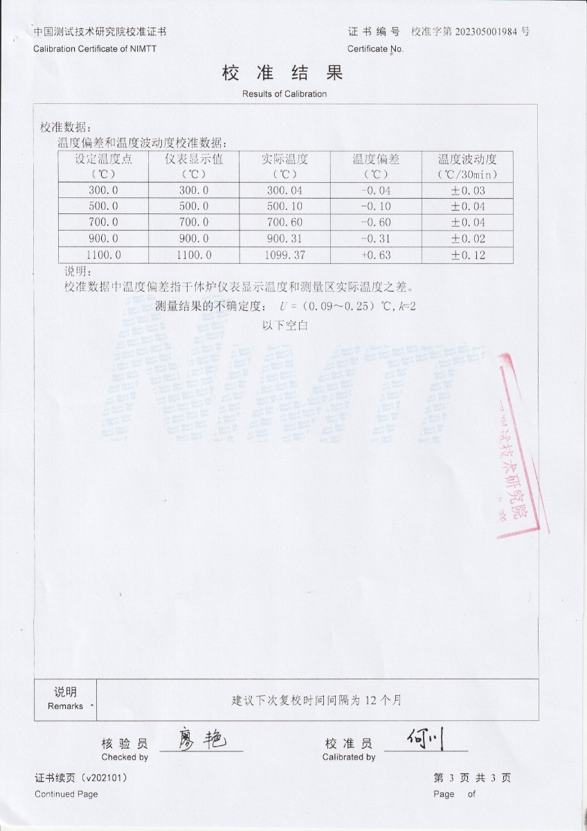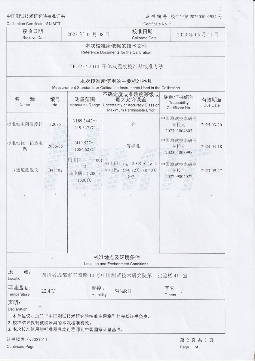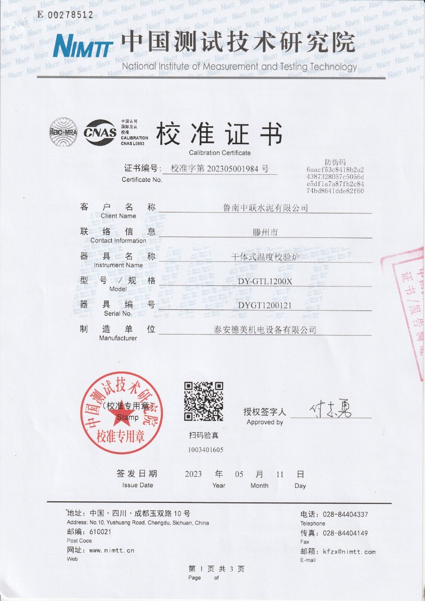 魯南中聯(lián)水泥有限公司 干體式溫度校準器 校準證書 2023-5-26 本文被閱讀 10273 次