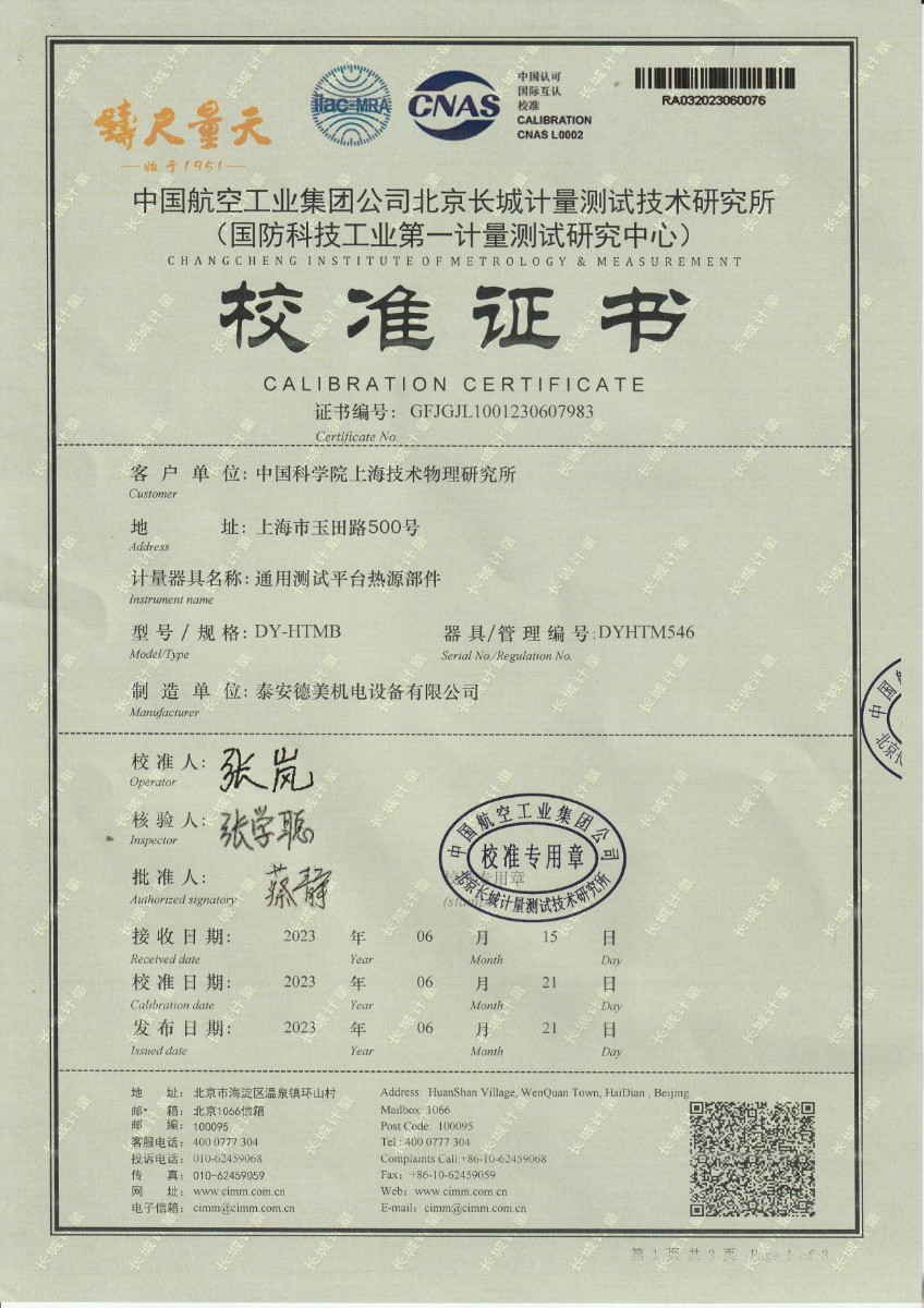 | 上一條:中國科學(xué)院上海技術(shù)物理研究所-通用測試平臺熱源部件(DYHTM545) | 下一條:高精度制冷恒溫槽(-80~100℃)校準(zhǔn)證書 |