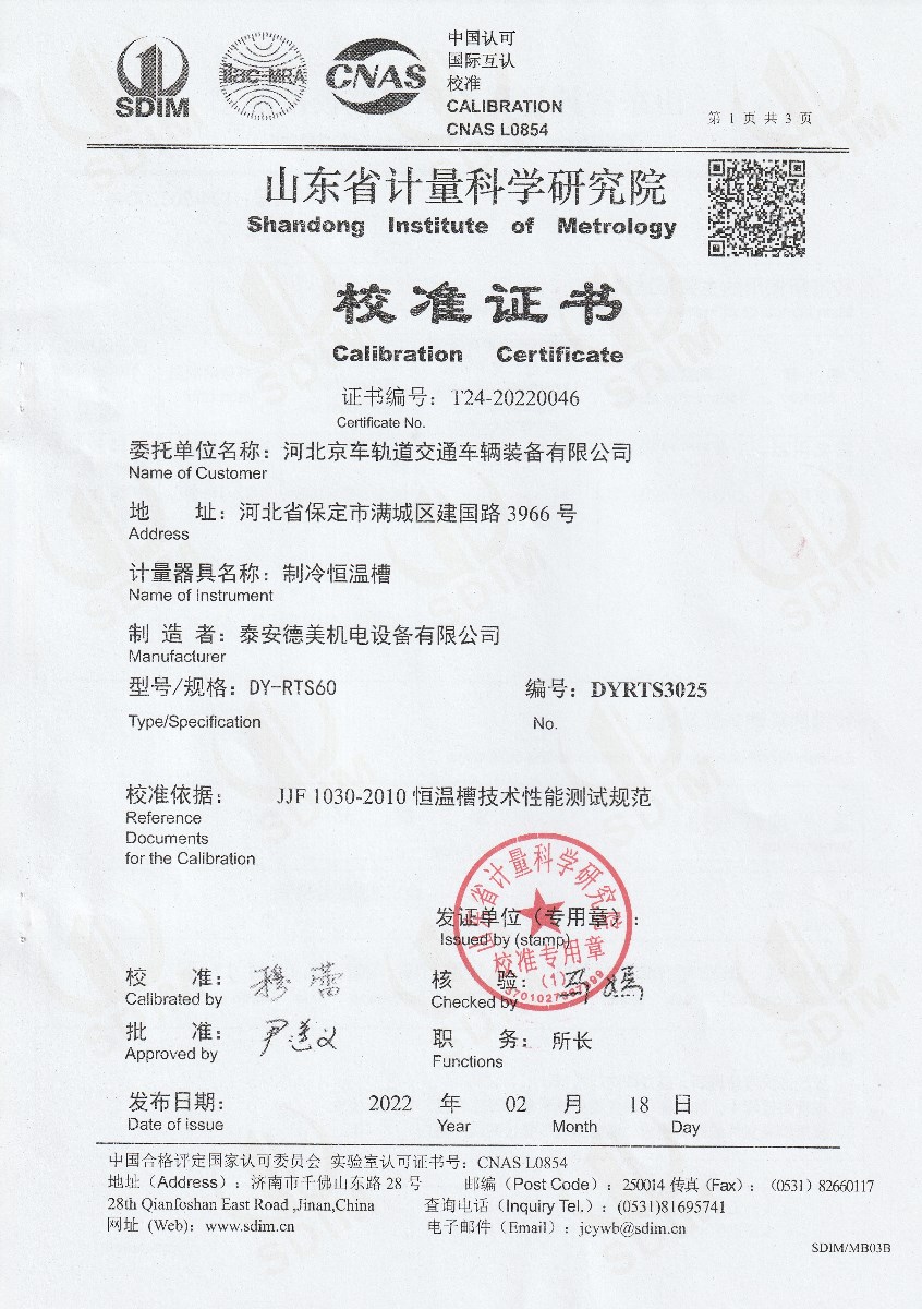 | 上一條:河北京車軌道交通車輛裝備有限公司-熱電偶檢定爐 | 下一條:高精度制冷恒溫槽(-80~100℃)校準(zhǔn)證書 |