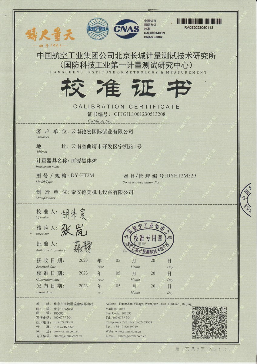 云南馳宏國際鍺業(yè)有限公司 面源黑體校準證書 2023-6-5 本文被閱讀 12402 次
